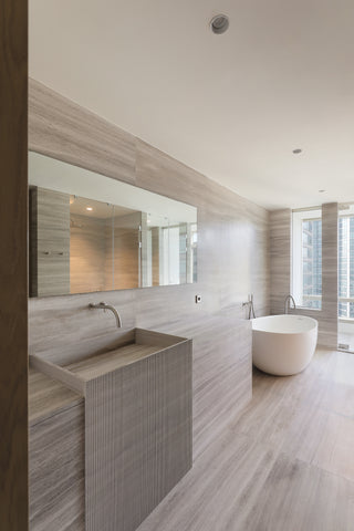 Brushed Inox tapware from the John Pawson by COCOON collection accentuate the tranquil marble tones within the space. Here less is more, as the floor to ceiling windows offer unparalleled views across the city whilst bathing.