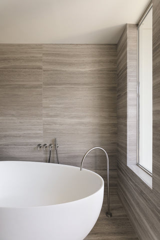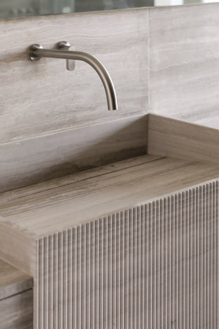 Brushed Inox tapware from the John Pawson collection made using AISI 316L stainless steel sits effortlessly alongside the natural movement of the grey marble. Carefully considered simplicity.