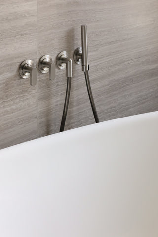 The handshower and two-way diverter show the discipline behind John Pawson's design. Reduced to essential geometry, the Brushed Inox finish sits quietly against the flowing marble. Form, function, intuitive use- nothing more, nothing less.