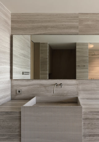 Unique, and in parts, fluted, grey marble flows throughout the entire space echoed by Brushed Inox tapware from the John Pawson by COCOON collection.