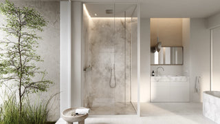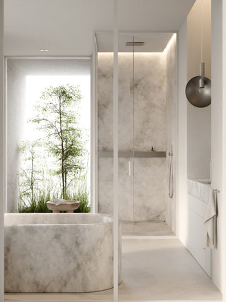 Soft, natural tones meet architectural precision in this luxury cream and beige bathroom. With daylight in abundance coming through the floor-to-ceiling glass, the space feels open while remaining intimate. Cream...