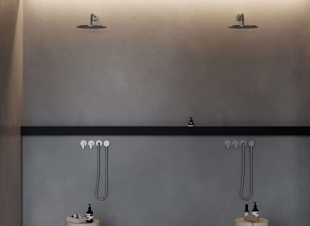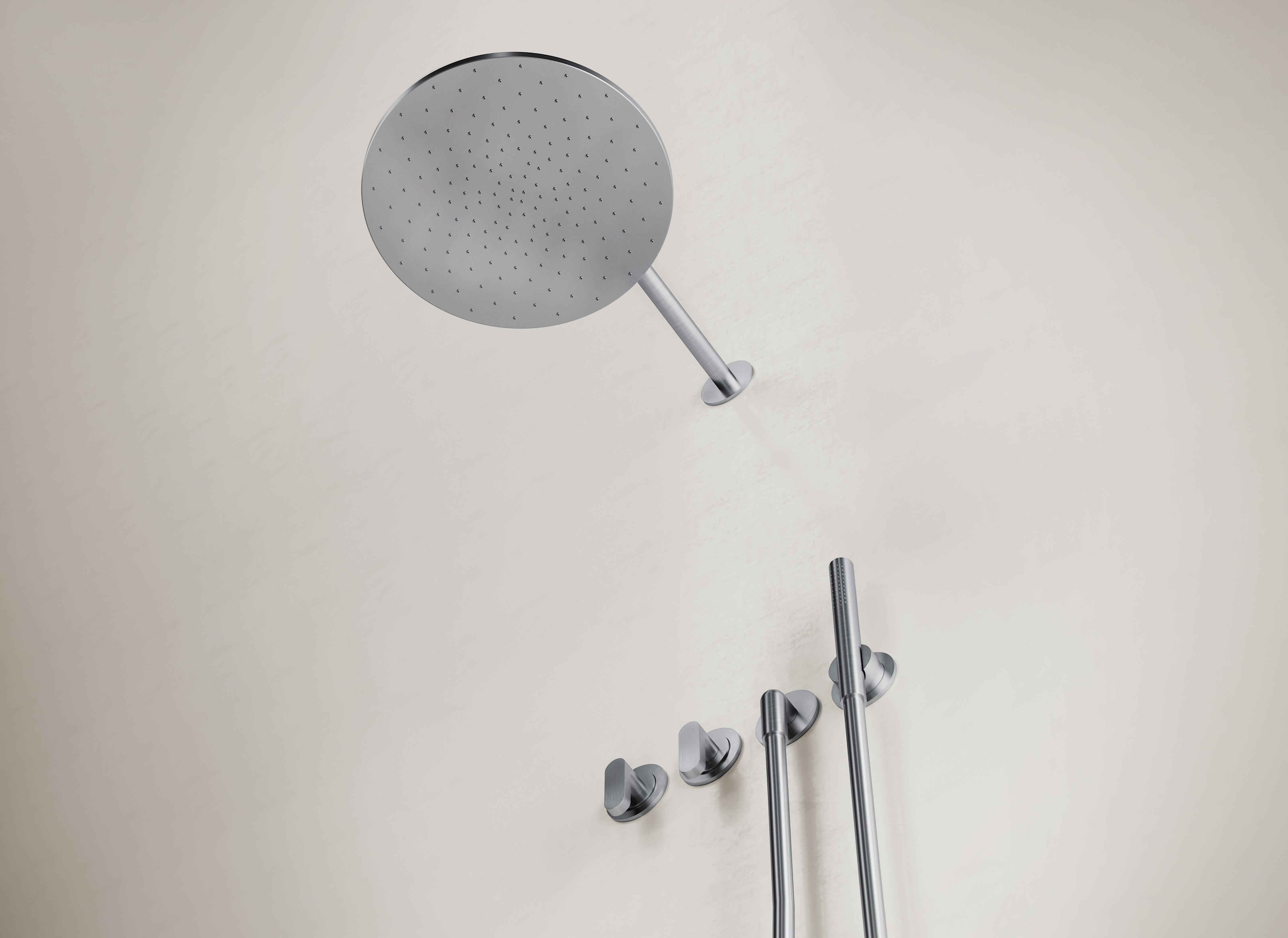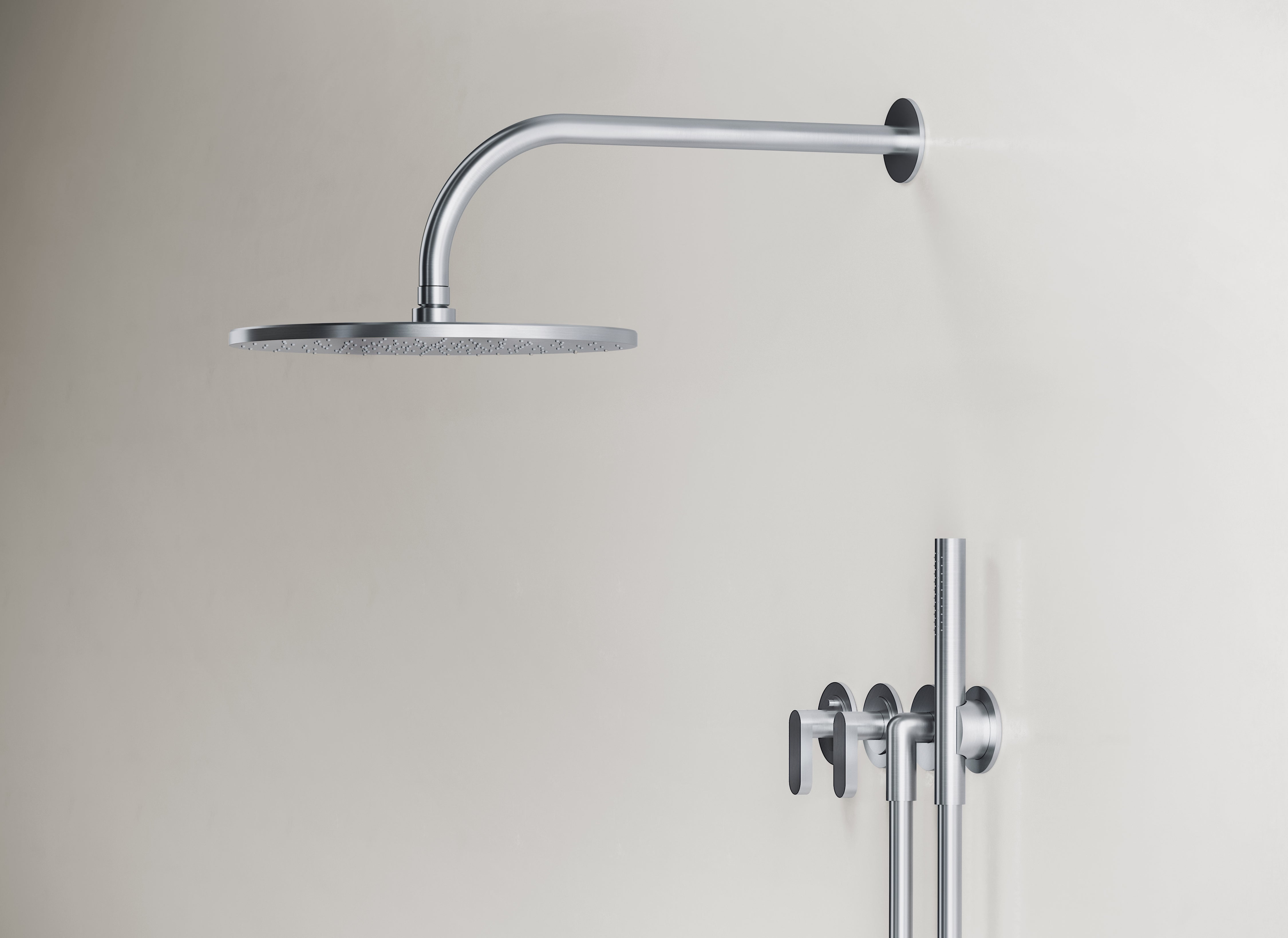 This complete thermostatic rain shower set features a thermostatic mixer, a two-way diverter, a wall-mounted rain shower and hand shower (available in 'stick' or 'round' model), all crafted from AISI 316L stainless steel and is available in Brushed Inox, Dark Grey and Brushed Gold finishes.
