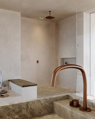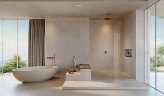 Enveloped in soft beige tones, this beautifully crafted suite makes mornings a gentle awakening. The open-plan space, awash with natural light, features an inviting freestanding Atlantis bath in Concrete05 and a spacious shower nook with a Beige marble MSN shower tray. A suspended vanity unit with Piet Boon Raw Copper fixtures serves as a dividing element between the bedroom and bath.