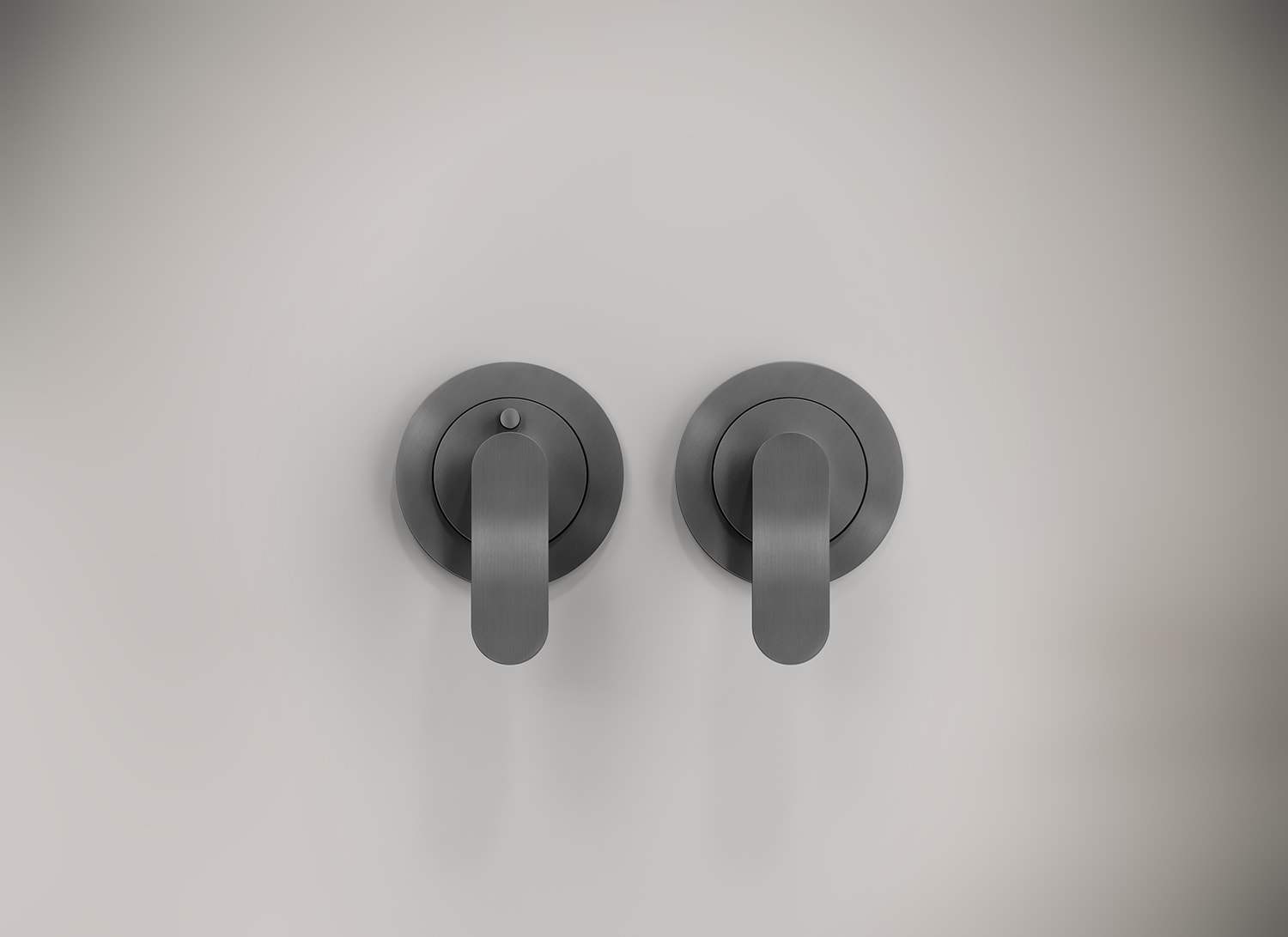 This wall-mounted thermostatic control and diverter set is crafted from AISI 316L stainless steel and is available in Brushed Inox, Dark Grey and Brushed Gold finishes.