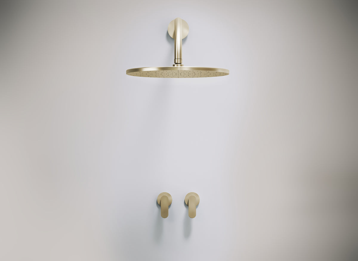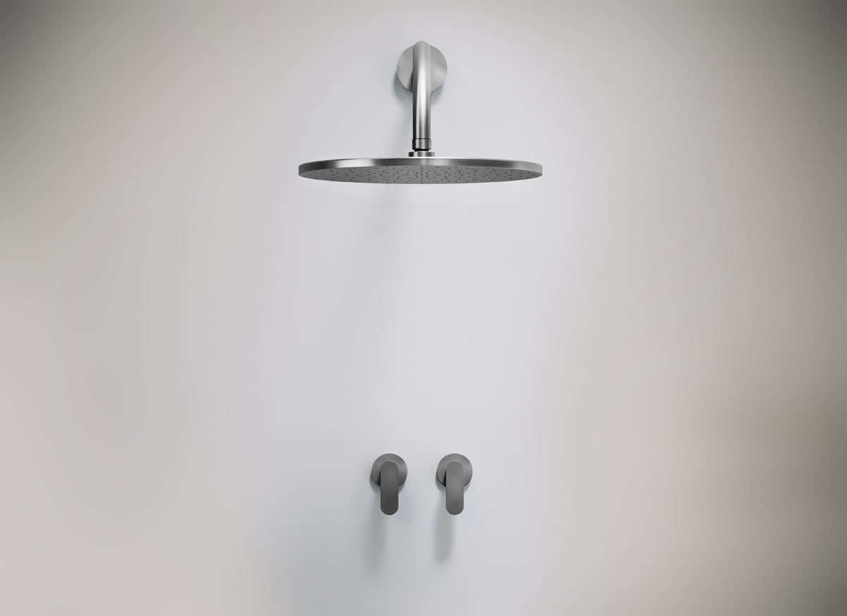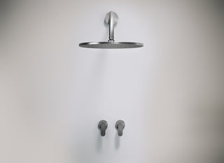 Rain shower with hot and cold water valve handle set, all crafted from AISI 316L stainless steel and is available in Brushed Inox, Dark Grey and Brushed Gold finishes.Â