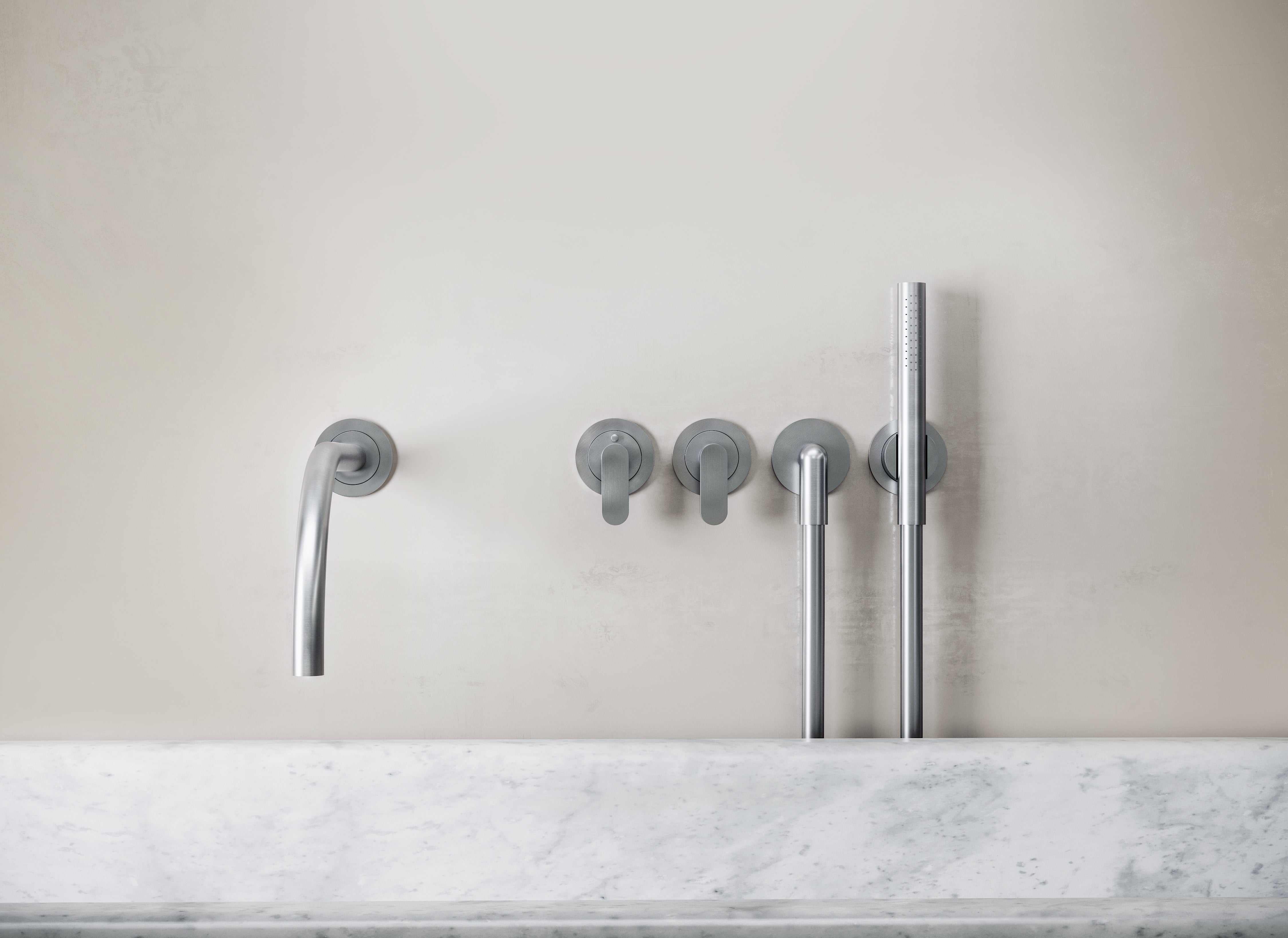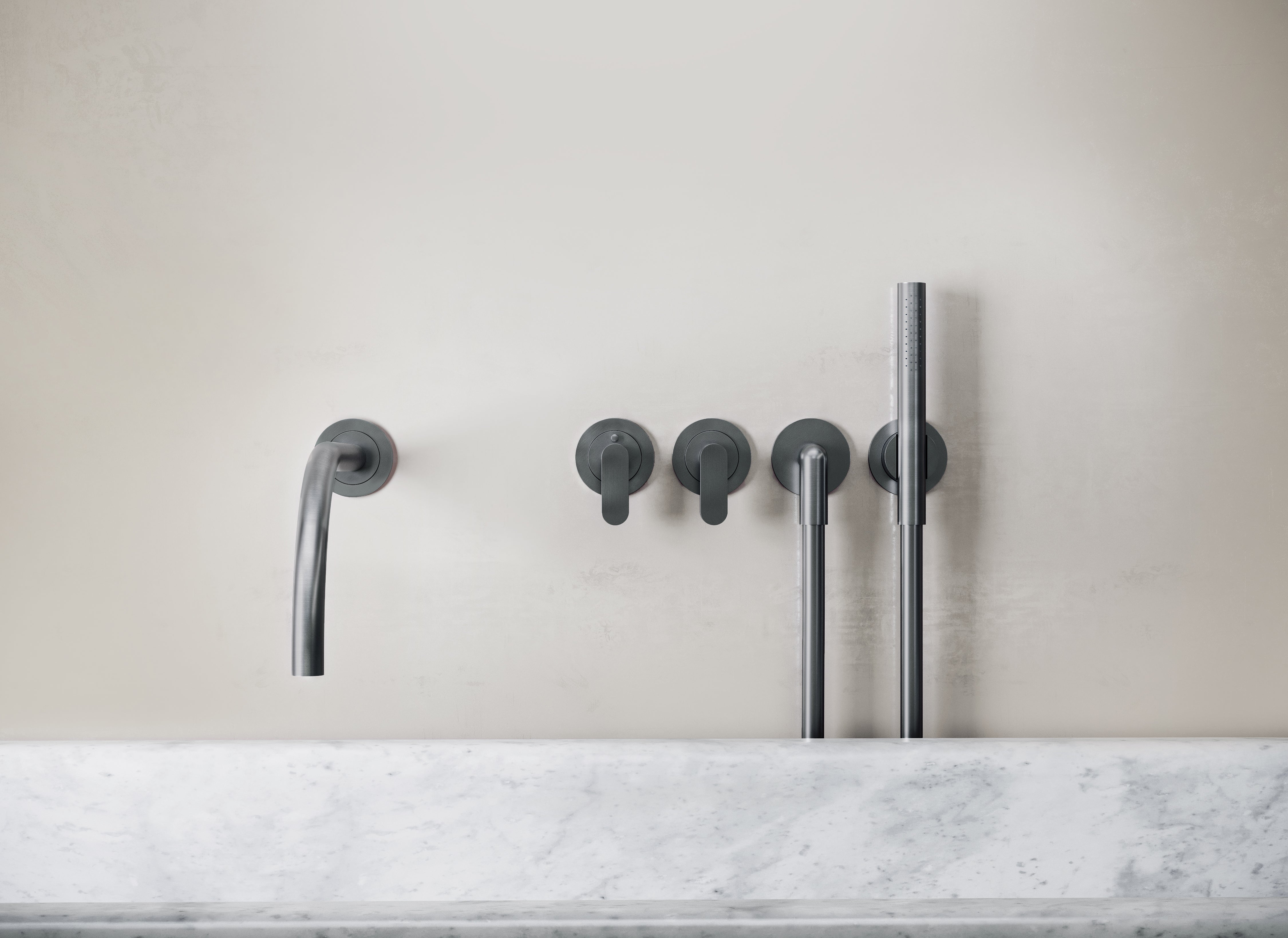 This complete thermostatic bath set features a thermostatic mixer, a two-way diverter, a wall-mounted bath spout and hand shower (available in 'stick' or 'round' model), all crafted from AISI 316L stainless steel and is available in Brushed Inox, Dark Grey and Brushed Gold finishes.